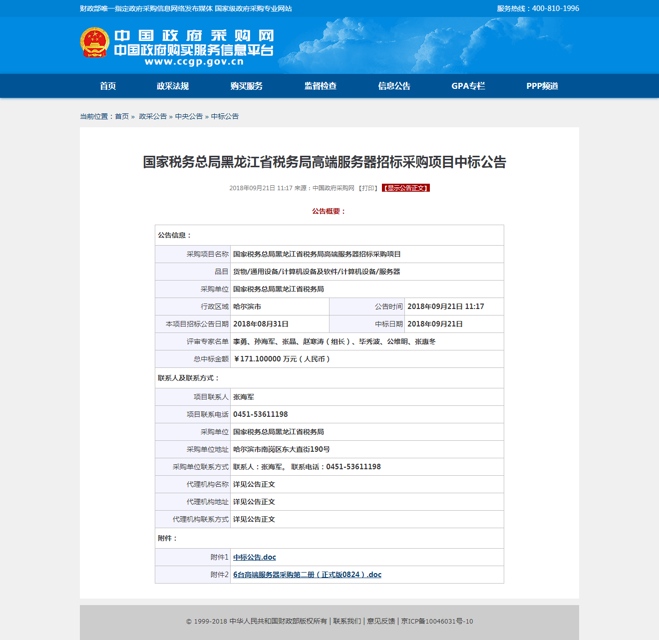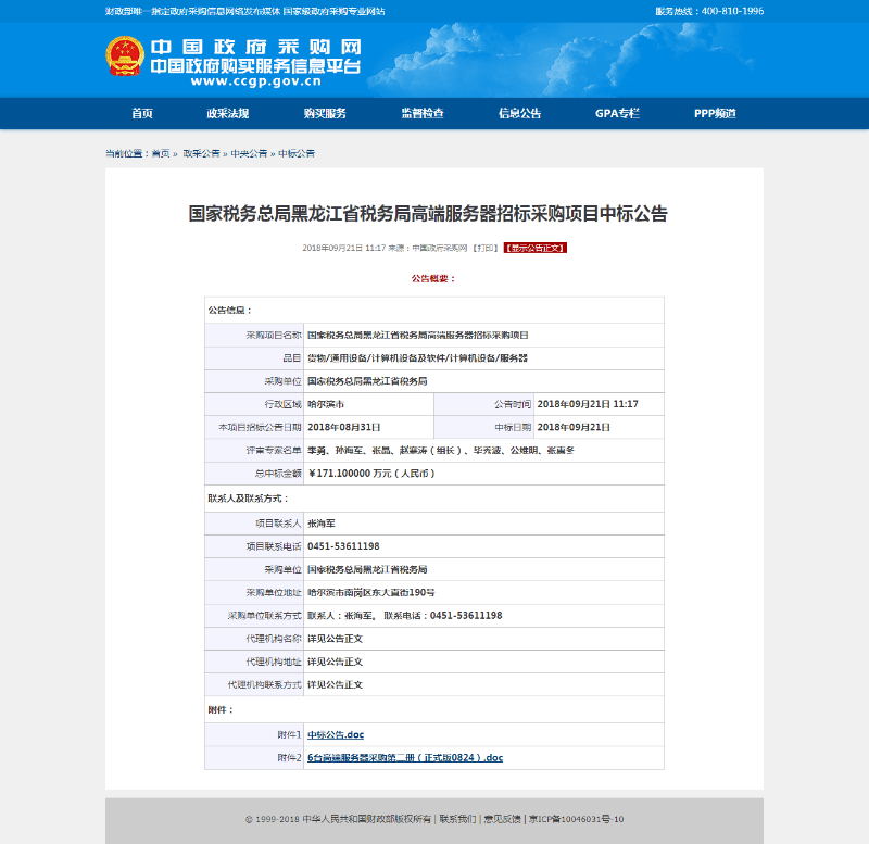国家税务总局黑龙江省税务局高端服务器招标采购项目中标公告