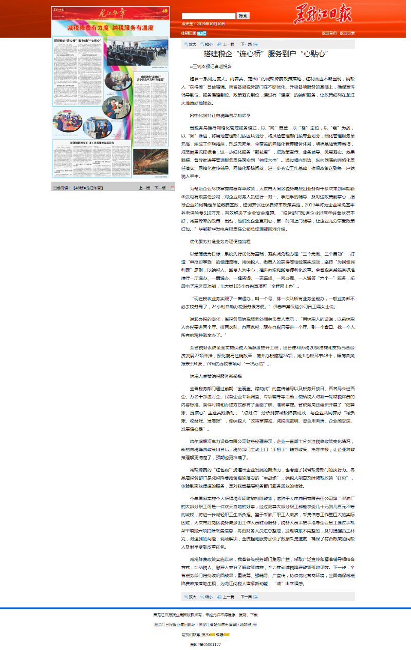 随着一系列力度大、内容实、范围广的减税降费政策落地,红利效应不断显现,纳税人“获得感”日益增强。我省各级税务部门在不断优化、升级各项服务的基础上,确保宣传辅导到位、服务保障到位、政策落实到位,通过有“温度”的纳税服务,让政策红利在龙江大地更好地释放。