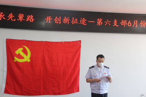“我志愿加入中国共产党……随时准备为党和人民牺牲一切,永不叛党。”铿锵恢宏的誓词,强烈震撼着在场的每一位党员,一字一句,神圣而豪迈,体现了党员同志们对中国共产党的无限忠诚。龙江县税务局第六党支部组织全体党员以重温入党誓词的形式,喜迎中国共产党99岁华诞,拉开了本次主题党日活动的序幕。