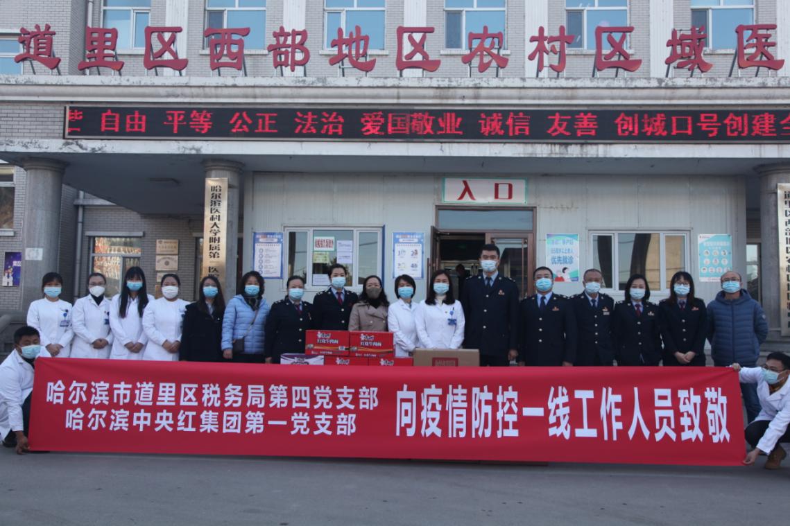 为进一步深化税企双方党建工作,打造税企联建品牌,近日,道里区税务局第四党支部与共建支部——中央红集团股份有限公司委员会第一支部,到道里区新发红十字医院,看望慰问坚守在疫情防控一线的医务工作者,为他们送上慰问品,并对他们勇于担当、甘于奉献的大爱精神致以崇高的敬意。