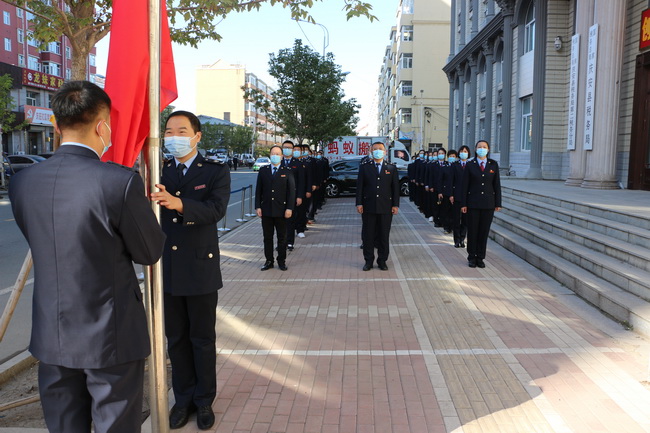 国庆假期后上班的第一天,国家税务总局庆安县税务局举行庄严的升国旗仪式,庆祝新中国成立72周年,县局党委书记、局长赵五洲主持升国旗仪式并讲话。