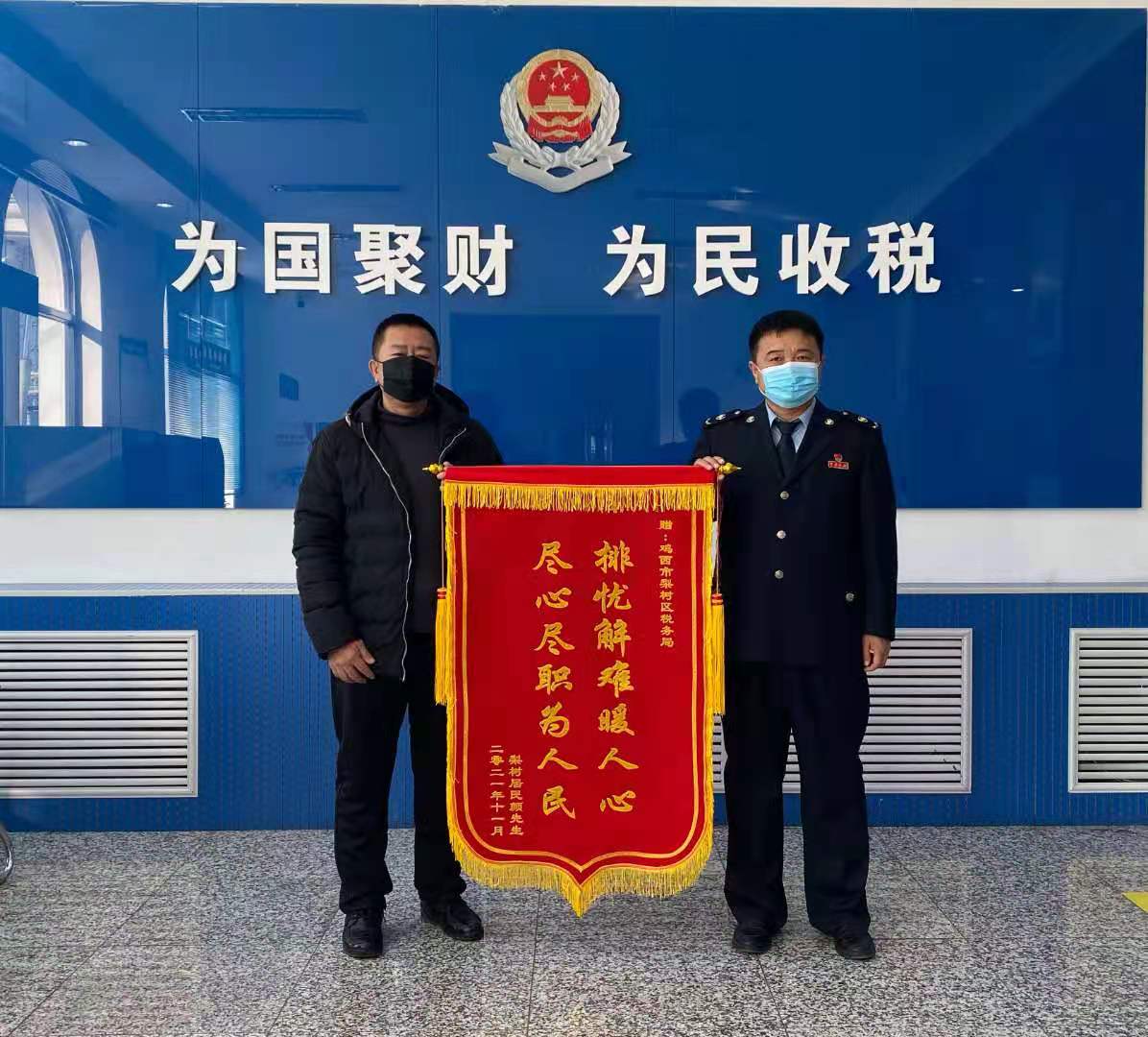 11月26日,纳税人颜先生将一面印有“排忧解难暖人心,尽心尽职为人民”的锦旗送到梨树区税务局,对办税服务厅工作人员吴伟和王丽君热情耐心的服务态度、专业精湛的工作水准表示衷心的感谢。
