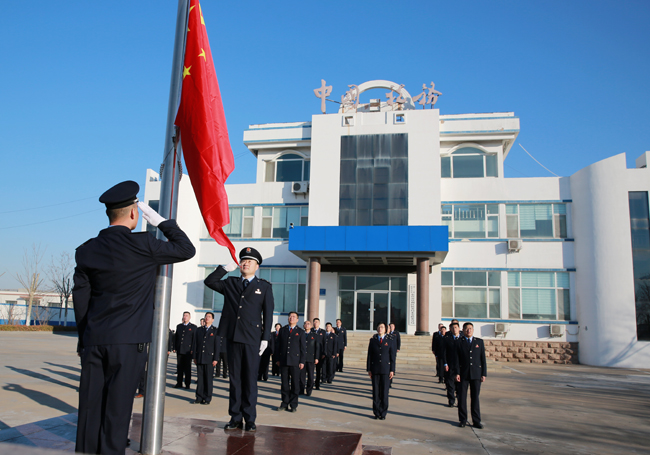 图为国家税务总局东营市垦利区税务局永安税务分局举行升旗仪式。(李洪文/摄)