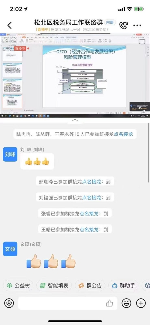 【直播带“课”分享学】依托钉钉软件,建立钉钉工作学习联络群,采用直播形式进行“云授课”,组织各部门业务骨干对税收政策热点问题进行了在线讲解。春节前,纳税服务科、第一税务所(办税服务厅)、货物和劳务税科、财产和行为税科、税收风险管理局、社保和非税收入科、所得税科共直播授课9次,培训1007人次。
