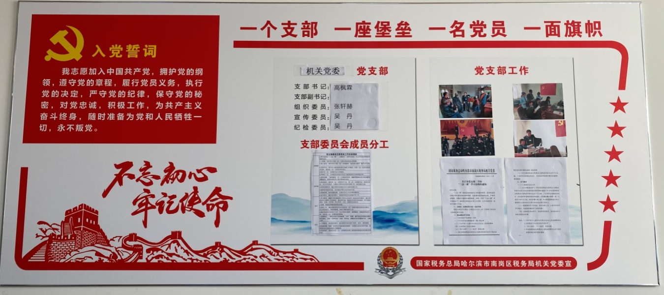 为进一步推动基层党组织规范化、标准化建设,提升党建工作质量水平,充分发挥党建引领保障作用,日前,南岗区税务局机关党委依据《哈尔滨市税务系统基层党组织规范化、标准化建设实施方案》,迅速行动,组成专班,结合各党支部办公区域实际情况,精心设计、加紧制作了45面党员活动墙,为全局45个党支部安装到位,成为该局党建工作特色标识。