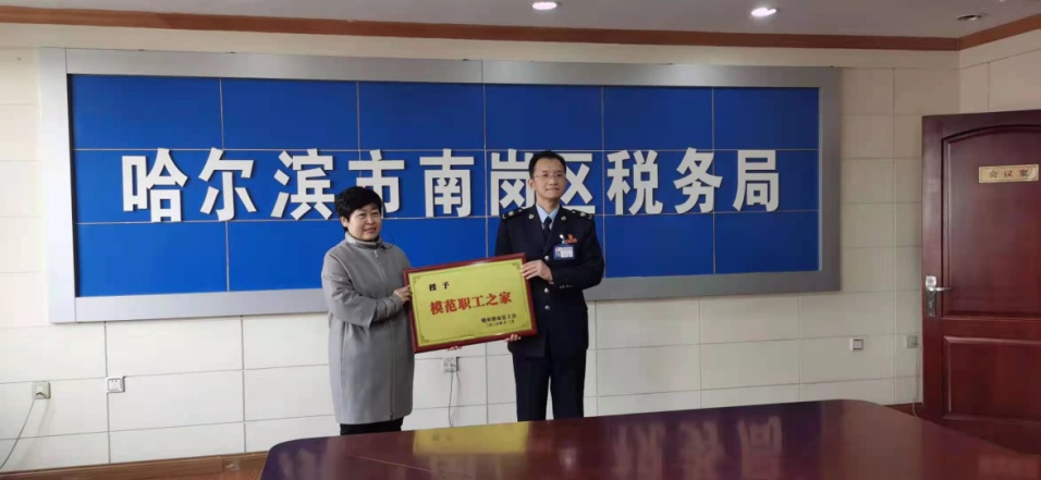 近日,南岗区税务局职工之家被哈尔滨市总工会授予全市“模范职工之家”称号。3月15日下午,南岗区总工会主席赵滨莉一行四人来到南岗区税务局,受市总工会委托向该局授奖牌,并颁发专项奖励2万元。
