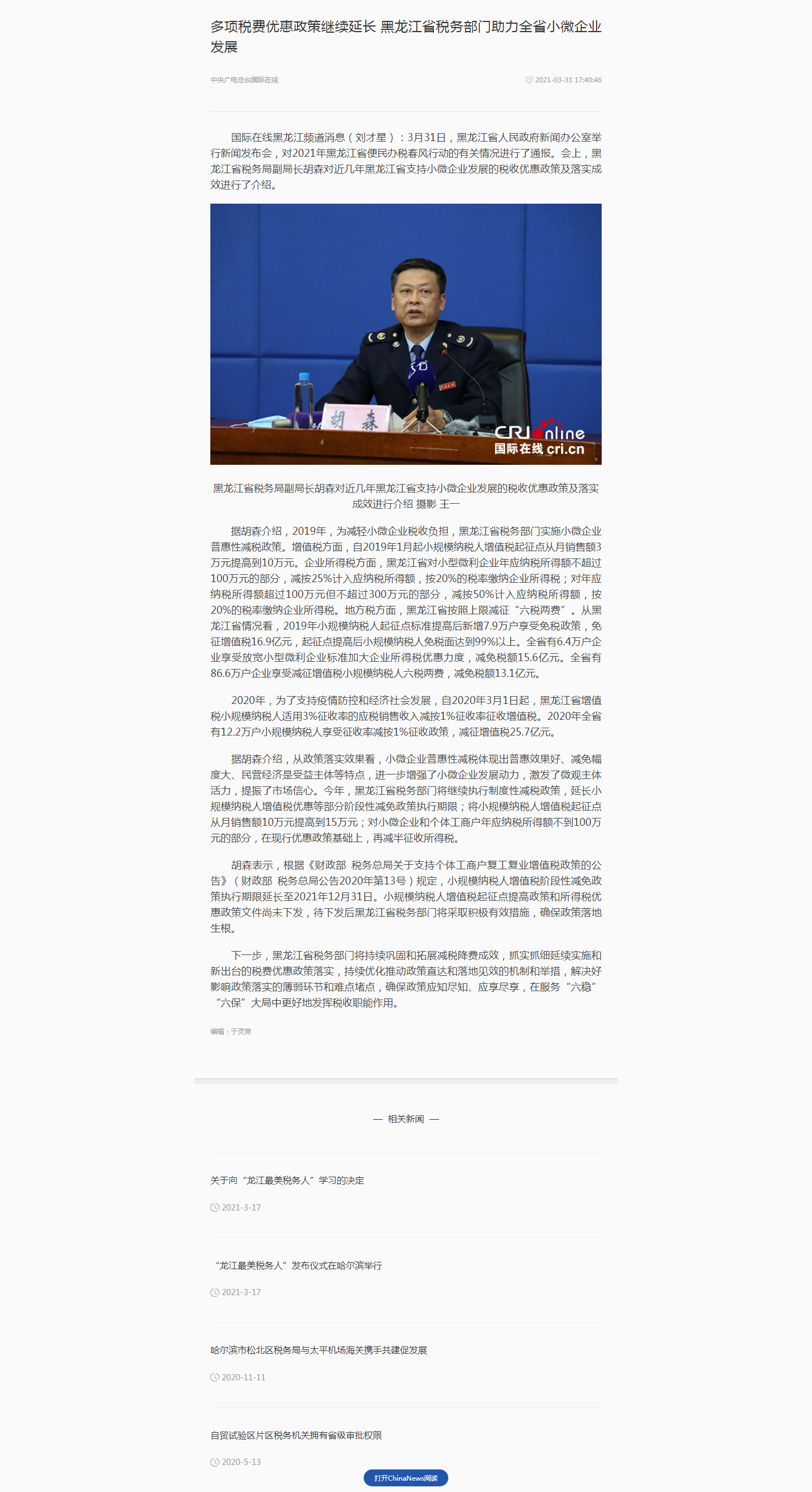 国际在线黑龙江频道消息(刘才星):3月31日,黑龙江省人民政府新闻办公室举行新闻发布会,对2021年黑龙江省便民办税春风行动的有关情况进行了通报。会上,黑龙江省税务局副局长胡森对近几年黑龙江省支持小微企业发展的税收优惠政策及落实成效进行了介绍。