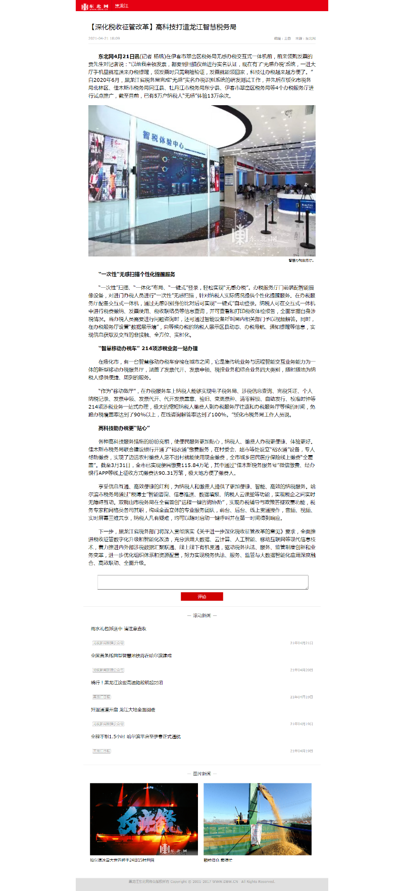 东北网4月21日讯(记者 杨帆)在伊春市翠峦区税务局无感办税交互式一体机前,前来领购发票的贾先生对记者说:“以前我来领发票,都要到扫描仪前进行实名认证,现在有了‘无感办税’系统,一进大厅手机里就推送来办税提醒,领发票时只需刷脸验证,发票就能领回家,科技让办税越来越方便了。”自2020年6月,黑龙江省税务局完成“无感”实名办税识别系统的研发测试工作,并先后在绥化市税务局北林区、佳木斯市税务局同江县、牡丹江市税务局东宁县、伊春市翠峦区税务局等4个办税服务厅进行试点推广,截至目前,已有5万户纳税人“无感”体验13万余次。