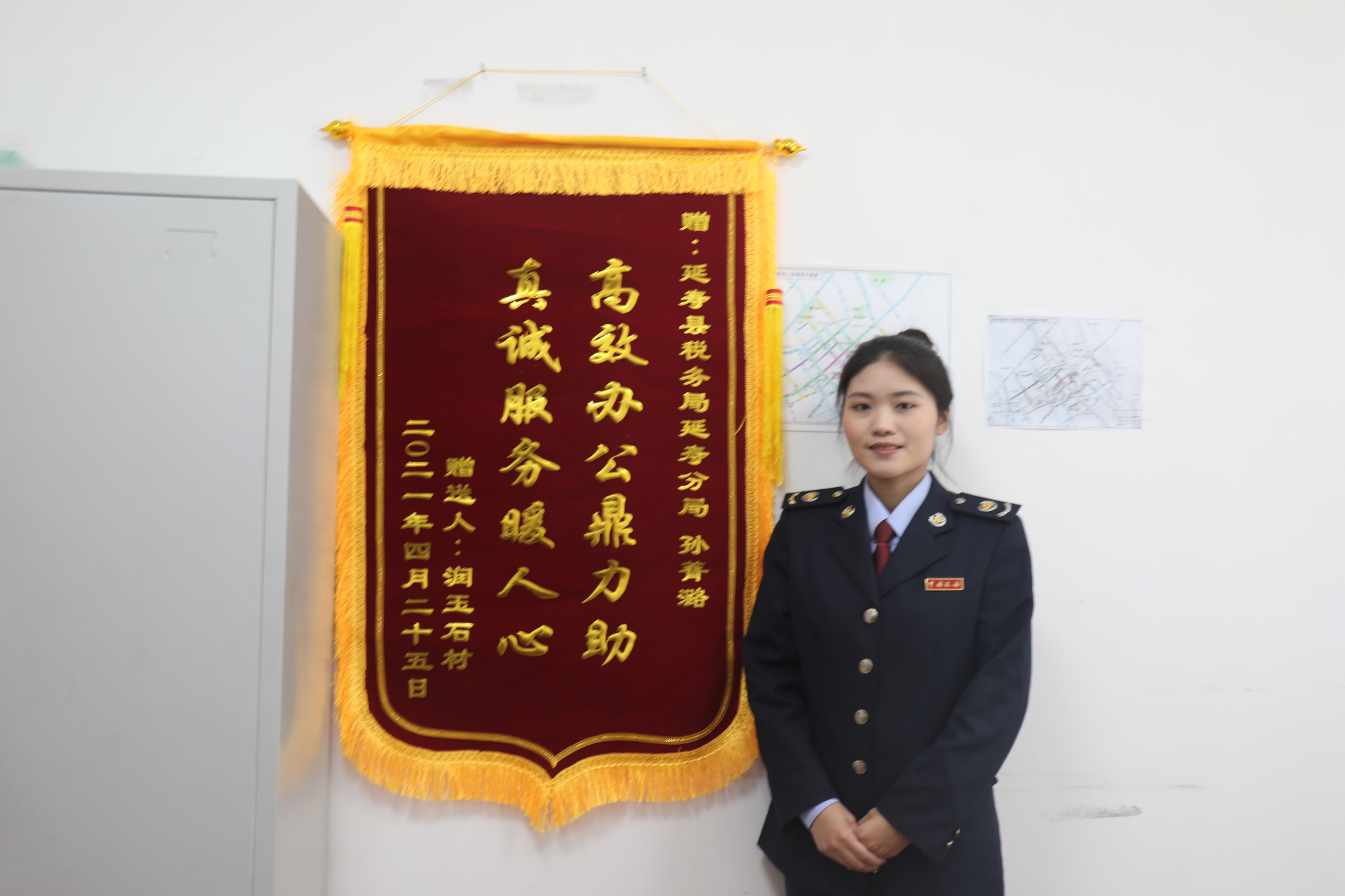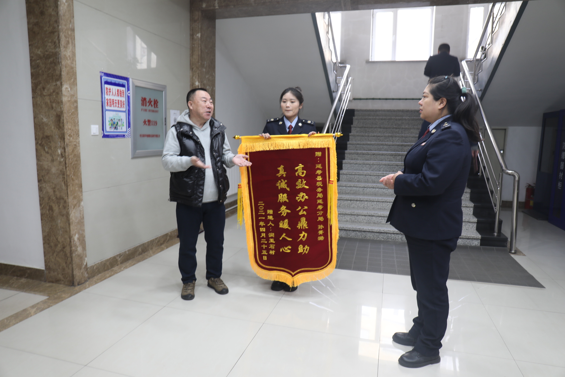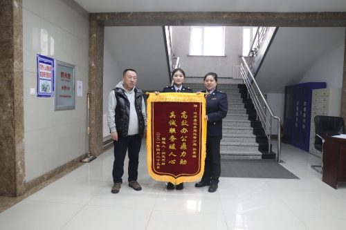 近日,延寿县润玉石材有限公司负责人将印有“高效办公鼎力助 真诚服务暖人心”的锦旗送到国家税务总局延寿县税务局延寿税务分局干部孙菁潞同志手中。表达对税务人员想纳税人之所想,急纳税人之所急服务举措的感谢。