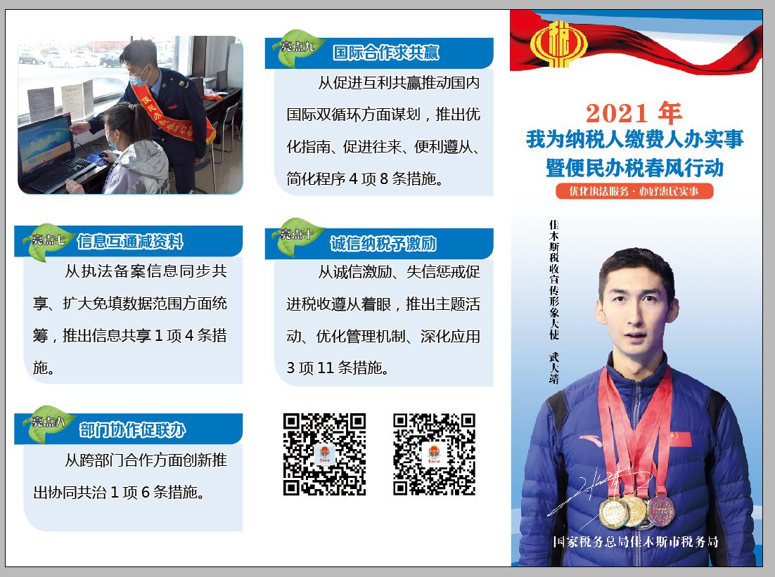 佳木斯市税务局深刻认识“春风行动”重要意义,不断创新活动形式,通过“一十百千万”“走出去+请进来”、印制“春风行动”宣讲海报、折页等形式,进行精准宣讲、精准辅导、精准答疑、精准落实,统筹推进“办好惠民实事”新举措落地生根,努力形成税收宣讲大格局。以树立“一”个税收宣传形象大使、聘请“十”名税收营商环境监督员、设立一“百”个税收宣传服务站、组织“千”名税务干部进“万”企走访等系列活动为载体,开展税收宣讲进社区、进企业、进校园、进机关、进网络的“五进”活动,通过“小水滴灌式”精准辅导,帮助企业便利办税,打通政策落地的“最后一公里”。印制以武大靖形象为主的宣传海报及手册19种38万余份,税收宣传形象大使与税务干部一起深入企业、深入公共场所开展宣讲活动,“春风行动”开展以来,佳木斯市税务系统共召开座谈会16场、座谈167人、收集13条意见建议、全部给予反馈。