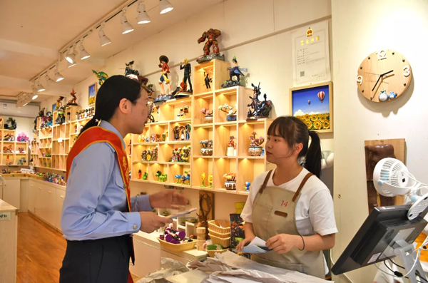 在贵州,国家税务总局贵阳市花溪区税务局税收宣传小分队走进青岩古镇,开展主题税收宣传活动。图为税务宣传员走进景区沿街商铺,了解纳税人优惠政策享受情况,为她们解决涉税疑惑。