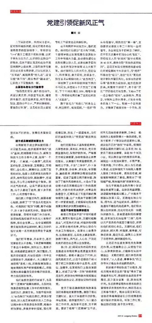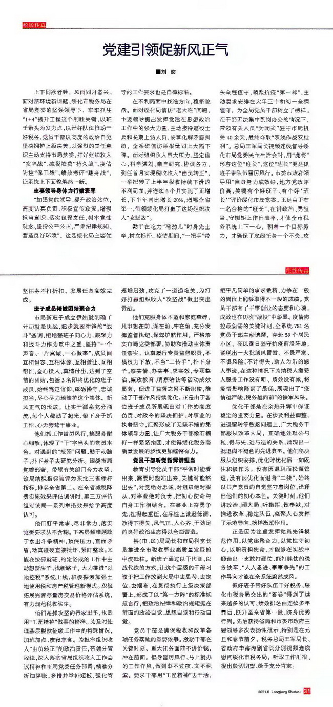 为深入总结重大改革和攻坚任务中坚持加强党的领导成功经验,市局办公室以《党委冲锋在前 干部勠力同心 绥化局以党建引领促新风正气》为题撰写上报了经验做法,得到了省局充分肯定,并在《龙江税务》(第5期)刊发,现发予各单位以适当方式组织学习研讨。同时希望各单位各部门以党史学习教育为契机,继续总结提炼加强党建引领,夯实党建基础的好经验好做法,将成果有效转化为税收事业发展的强劲动能,奋力实现“十四五”时期税收工作良好开局,以优异成绩庆祝建党100周年。