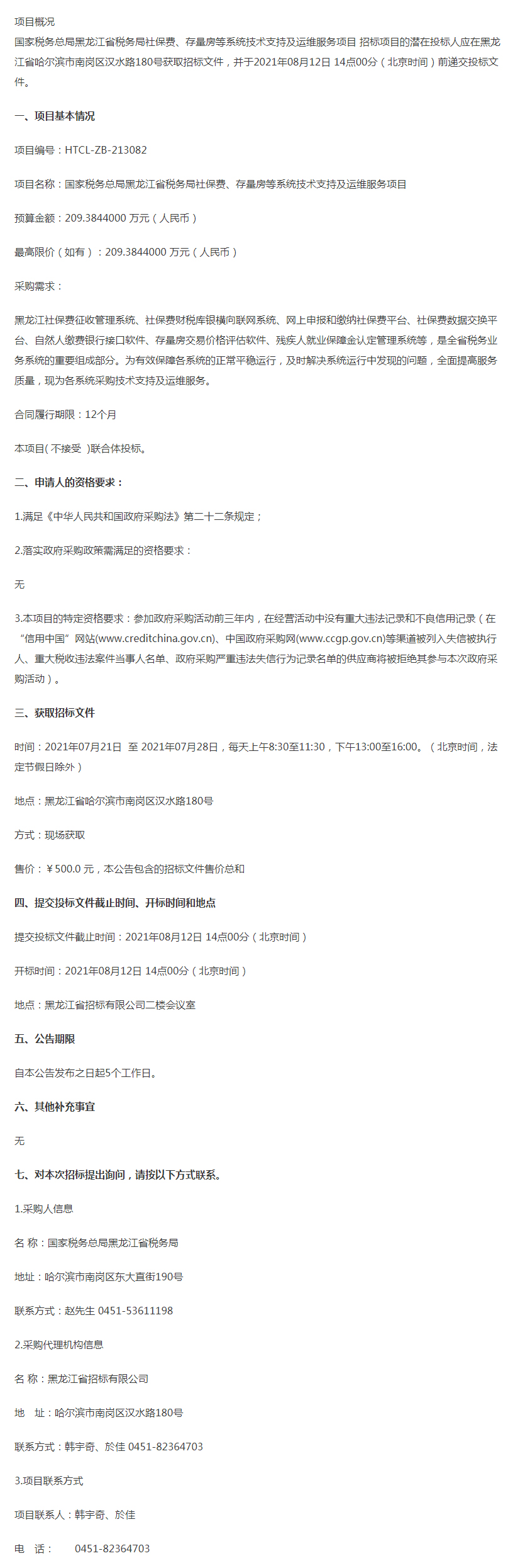 国家税务总局黑龙江省税务局社保费、存量房等系统技术支持及运维服务项目公开招标公告