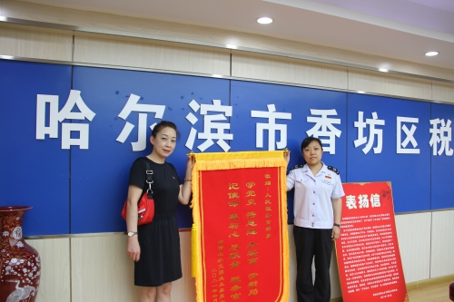 2021年7月7日,海富山水文园业主委员会代表来到香坊区税务局中山路办公区,向第一税务所副所长韩真赠送了一面锦旗和一封装裱精美的巨幅表扬信,以此表达他们的真诚谢意。