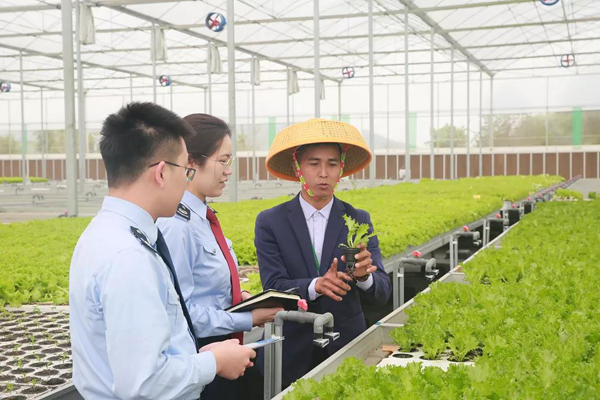 国家税务总局广州市花都区税务局干部走进绿沃川公司生产基地,了解蔬菜种植情况,为企业送去最新税费优惠政策。