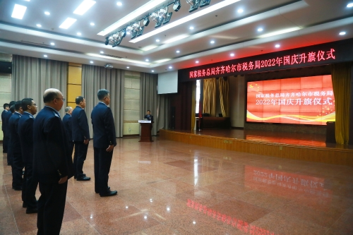 10月8日上午9时,齐齐哈尔市税务局举行2022国庆升旗仪式,伴随着雄壮的《义勇军进行曲》,全体人员肃立行注目礼,表达对祖国的美好祝福。