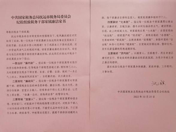 方寸之间饱含真挚,尺牍内外承载嘱托。“抚税廉洁家书”发出后在全局干部职工和家属中引起了强烈反响,干部家属们表示,这是一份别样的“廉”味祝福,将在今后的生活中当好“廉内助”、吹好“廉洁风”、守好“廉政门”,在“税务+家廉”上站好岗、放好哨,在八小时外守护清廉税务,共筑最强防线。