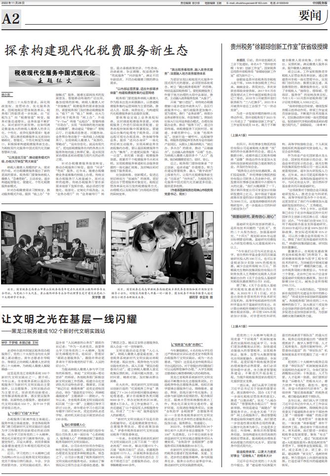 黑龙江省税务系统新时代文明实践站不断整合优化志愿服务团队,打造税务特色志愿服务品牌。组织开展学雷锋志愿服务行动,围绕敬老、爱幼、帮困、助残开展个性化服务;主动参与新冠肺炎疫情防控,配合做好社区、隔离点管控和核酸检测点工作;常态化开展文明交通劝导、爱护环境、垃圾清捡等服务项目;实施“金秋助学 金税圆梦”志愿服务项目……全省各地税务新时代文明实践站通过形式多样的志愿服务活动,投身公益、服务群众、传递爱心。