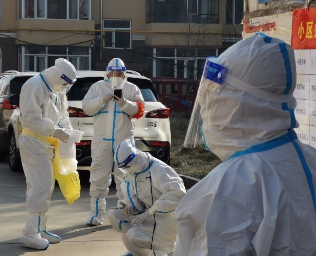 袁锋岩(左一)董亮(左二)张尚晋(左三)正在协助社区工作人员采集核酸
