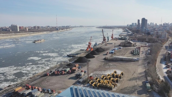 正值冬日,黑龙江的江面已经封冻,黑河港务局有限公司的生产现场仍然呈现出一片繁忙的运输景象。大型集装箱密集进出,工作人员日夜奋战,满载煤炭等货物的重型卡车往来穿梭、有序作业。