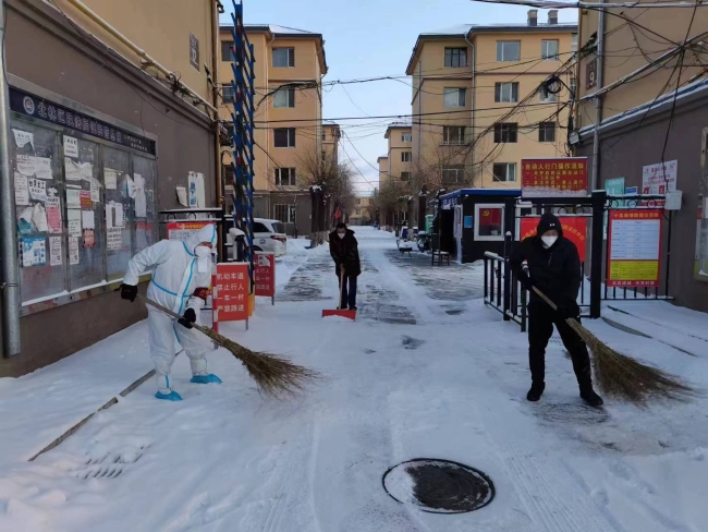 史广权(左一)带领值守人员为小区清理积雪