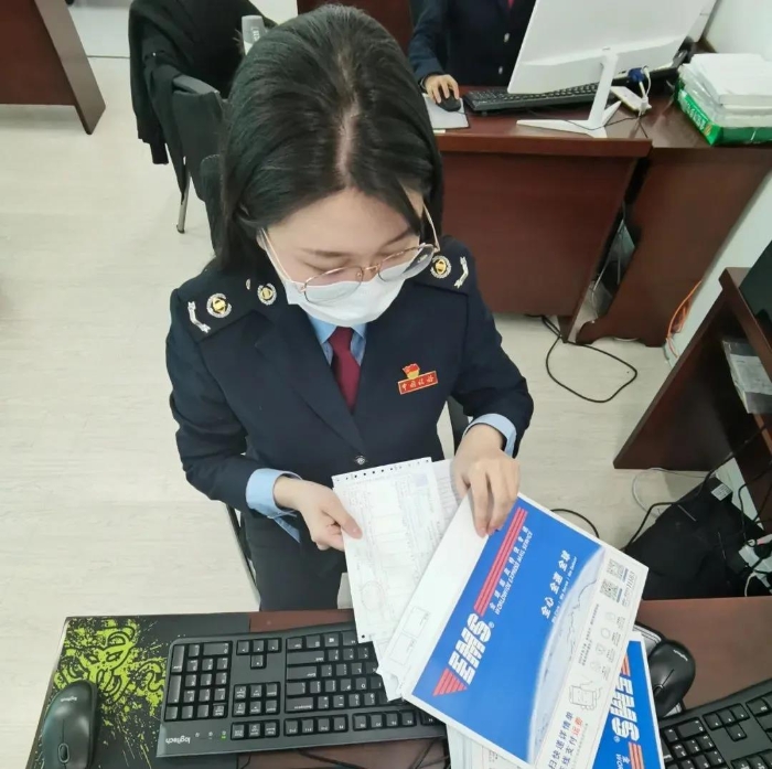 图为国家税务总局哈尔滨市松北区税务局通过“税务快递”为纳税人将发票免费邮寄到家。