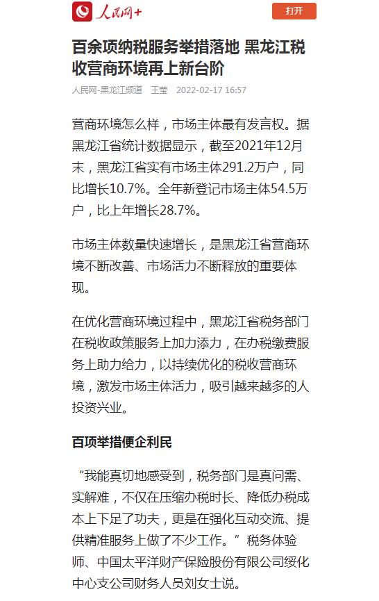 在优化营商环境过程中,黑龙江省税务部门在税收政策服务上加力添力,在办税缴费服务上助力给力,以持续优化的税收营商环境,激发市场主体活力,吸引越来越多的人投资兴业。