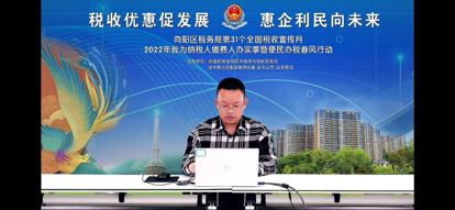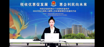 为深入开展以“税收优惠促发展 惠企利民向未来”为主题的全国第31个税收宣传月,持续促进第9年“我为纳税人缴费人办实事暨便民办税春风行动”,在严格遵守疫情防控各项要求的前提下,4月18日晚7点,国家税务总局黑龙江省佳木斯市向阳区税务局围绕“税务蓝+志愿红+便民绿”的宣传主线,联合向阳区委统战部、区非公办和区新联会通过抖音平台——“佳木斯便民资讯”举办电子税务局操作讲解网络直播课堂。国家税务总局黑龙江省佳木斯市向阳区税务局开展网络直播旨在利用创新的“非接触”形式,通过网络云端向纳税人缴费人讲解电子税务局常用功能简介及操作方法,让纳税人缴费人足不出户就能轻轻松松地掌握电子税务局的常用操作方法,通过巩固党史学习教育成果,扎实为纳税人缴费人办实事。