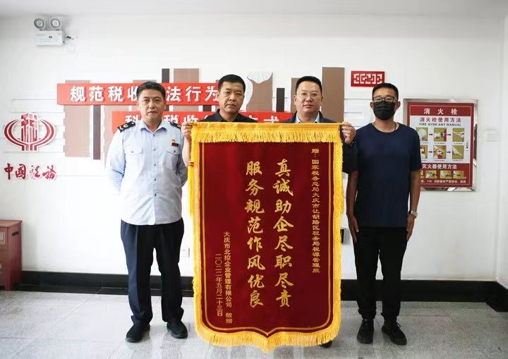 近日,大庆市北控企业管理有限公司财务总监丁铁力专程到大庆市让胡路区税务局送上一面写有“真诚助企尽职尽责,服务规范作风优良”的锦旗,以此感谢税务机关全力优化营商环境,为企业纾难解困的服务之举。丁铁力表示,税务机关落实政策不打折扣,工作人员纳税服务周到细致,业务办理高效快捷,让企业真真切切地享受到了国家的政策红利。