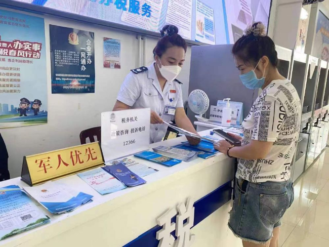 图为办税服务厅导税员为纳税人辅导税收优惠政策