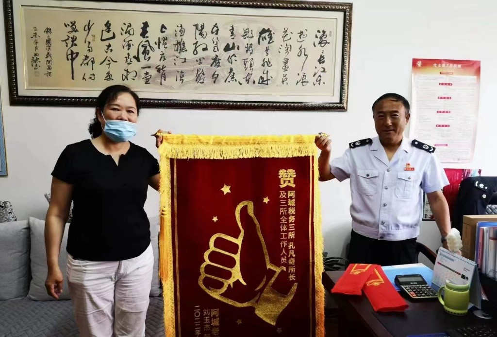 “孔所长,我们来送锦旗啦!感谢税务工作人员为我们解决了这个大难题。”见到哈尔滨市阿城区居民刘玉杰等人时,她们刚把锦旗交到哈尔滨市阿城区税务局第三税务所。
