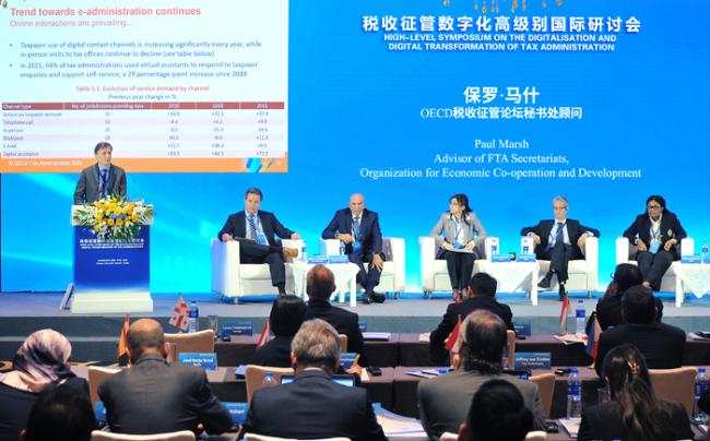 研讨会上,经济合作与发展组织税收征管论坛秘书处主任彼得·格林和秘书处顾问保罗·马什深入介绍了经合组织发布的全球《税收征管3.0》推进的最新进展。阿联酋、阿尔及利亚、马来西亚、匈牙利、巴西、澳大利亚、西班牙、日本、韩国等国税务局长和国际货币基金组织等国际组织负责人分别作了专题发言或主持专题研讨,分享了各自在税收征管数字化转型的实践经验及研究成果,分析了面临的困难和挑战,并探讨了后续行动规划。