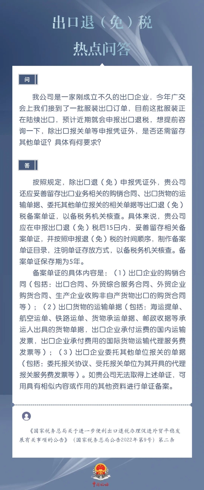 为进一步加力支持包括中小微企业在内的广大经营主体开展外贸出口业务,便于企业掌握出口退税现行规定、及时了解出口退税便利化举措,商务部、国家税务总局针对企业普遍关心的出口退税热点问题,整理了问答集锦。我们将陆续发布热点问答相关内容,今天发布:企业申报出口退税,除报关单等申报凭证外,是否还需留存其他单证?具体有何要求?