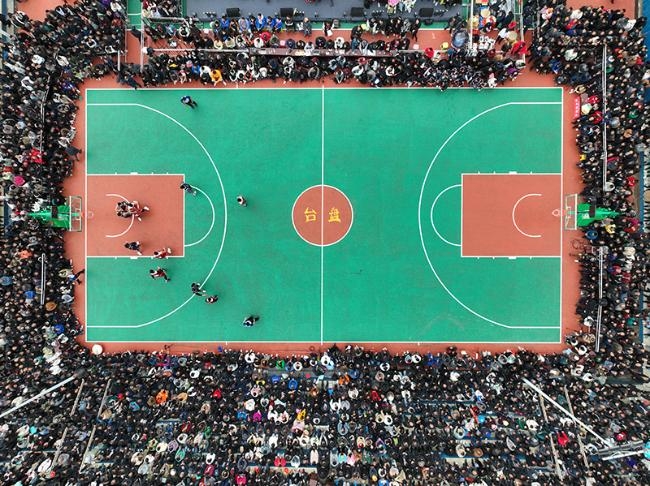 (这是2023年3月27日在贵州省黔东南州台江县台盘村拍摄的贵州省首届“美丽乡村”篮球联赛总决赛比赛现场(无人机照片)。新华社记者 欧东衢 摄)