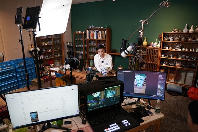 (在江西景德镇陶溪川文创街区的直播基地里,工作人员通过网络直播推介陶瓷产品(2023年2月22日摄)。新华社记者 周密 摄)