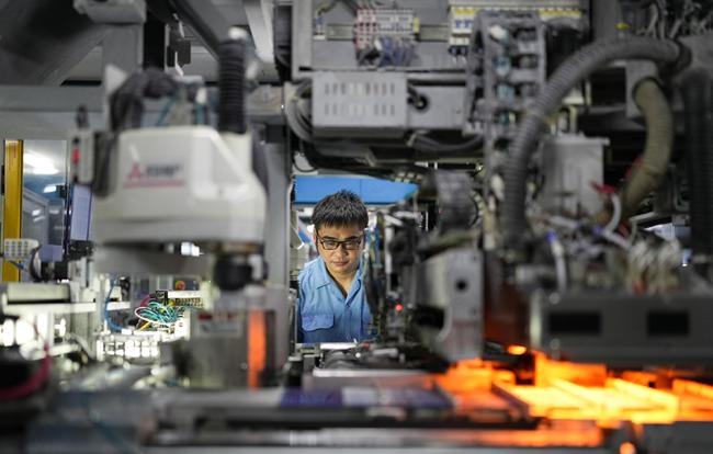 (2023年8月9日,在浙江省台州市黄岩区省级专精特新“小巨人”企业浙江公元新能源科技股份有限公司,工作人员操作全自动焊接机生产太阳能电池片。新华社记者 翁忻旸 摄)