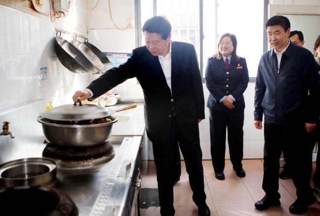 图为王军深入兰考县税务局兰阳税务分局食堂实地了解干部职工生活情况