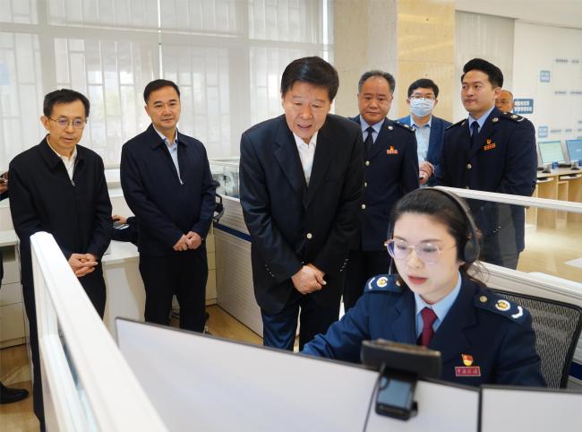 图为王军在郑州市税务局税费业务网上集中处理中心调研