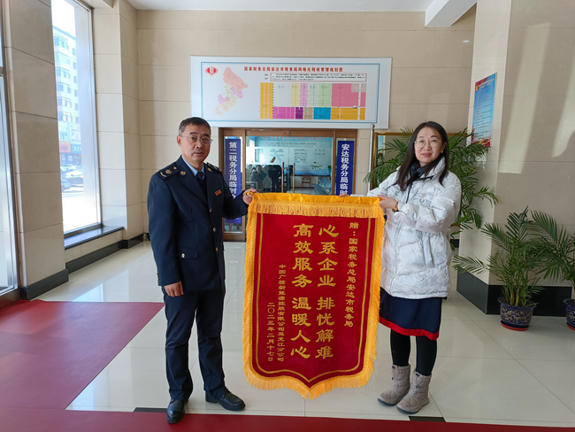 2月20日上午,中国广核新能源控股有限公司黑龙江分公司财务总监刘君女士,带领税务经理、业务经理、安达光伏中心站场长等一行四人,携带早已准备好的锦旗和感谢信,特意从哈尔滨驱车来到安达市税务局,感谢税务局长期以来对企业的帮助和关爱,安达局党委欣然收下企业赠送的印有“心系企业排忧解难,高效服务温暖人心”锦旗和感谢信,并同企业进行亲切座谈。