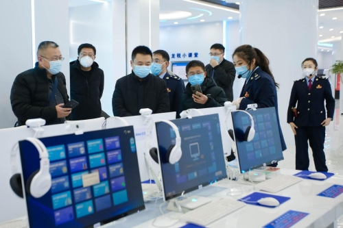 最后,在主办公区,工作人员向来访人员介绍了一楼智慧办税服务厅13个功能区域,体验了二楼云桌面办税厅与微舱专属服务区、云桌面、自助设备、企业端远程问办等终端的接听答疑,对综合指挥中心1+6综合展示区及各办税场所监控区进行了深入了解,通过执法与服务模块,运用GPS+北斗定位技术,实时观看到了管理部门执法与服务的全过程。