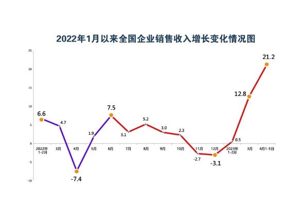 日前,在国务院新闻办公室举行的“权威部门话开局”系列主题新闻发布会上,国家税务总局局长王军以一张从去年1月至4月5日全国企业销售收入的增长变化情况的图表,生动展示了我国着力推动经济运行整体好转,经济发展实现较好开局。