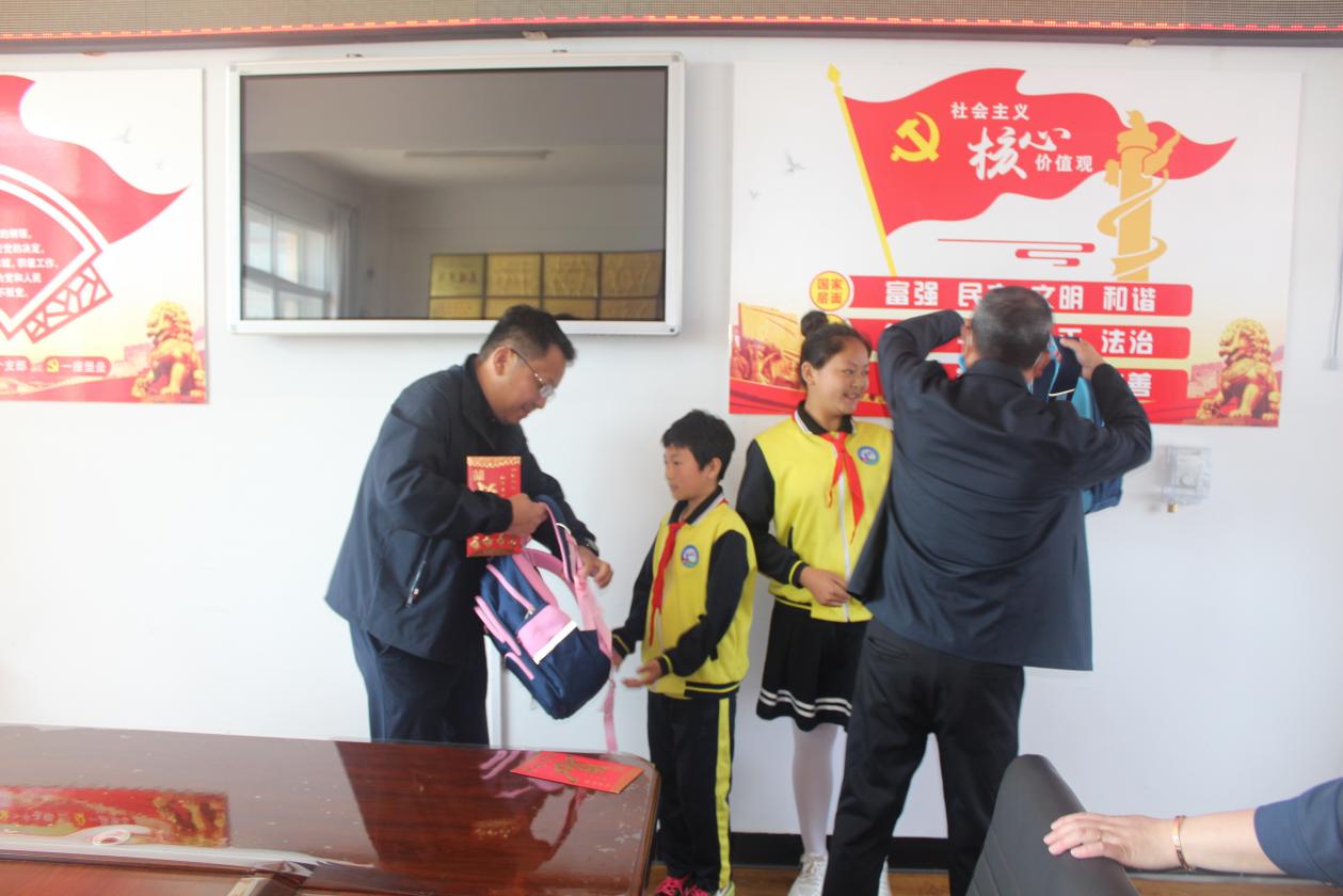 在学校会议室内,税务局党委书记、局长刘晓锋同志,党委委员、副局长柳向龙同志、妇委会主任王敬威同志同天门乡政府副书记孙宇同志、副乡长王凤莲同志先向学校询问了困难儿童的基本情况,然后将提前准备好的助学金、书包、笔袋、彩笔等慰问品一一送到了孩子们手中,孩子们都很开心,脸上洋溢着纯真笑容。孩子们表示,一定会铭记领导和老师们的关心和帮助,以感恩的心,以实际行动,刻苦学习,长大后继续传递友爱互助精神,为社会做贡献。