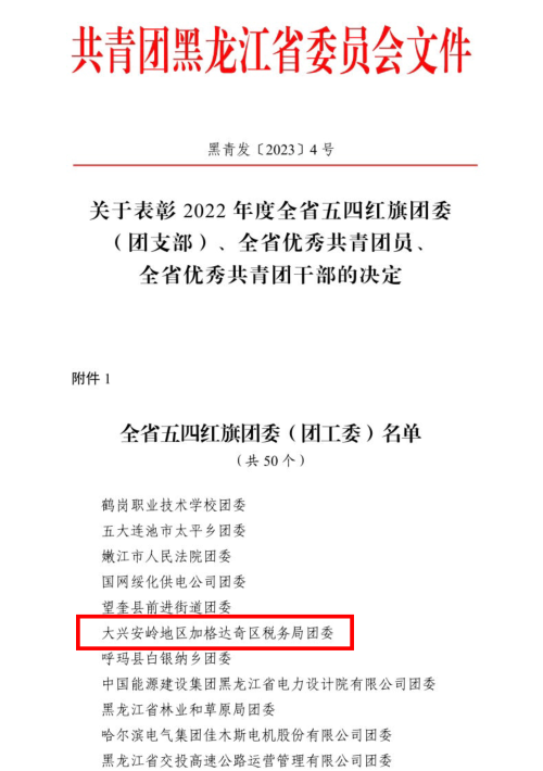 近日,加格达奇区税务局团委在本次表彰中荣获“全省五四红旗团委”称号。
