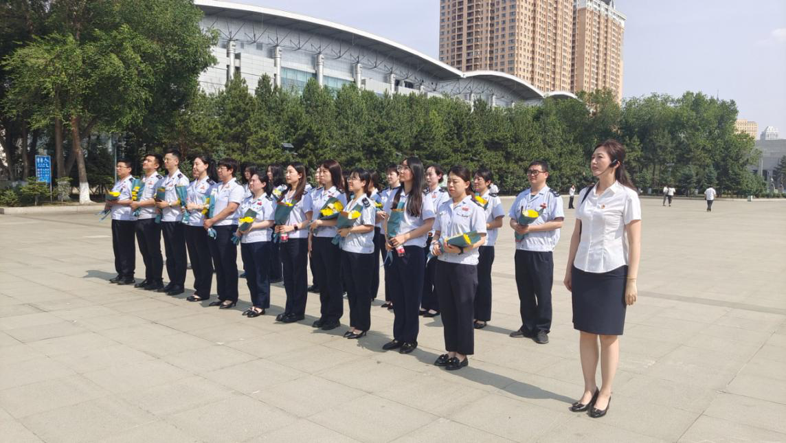 道外局党委委员、总经济师、青年理论学习小组导师刘强军带领20余名青年干部代表来到长青公园,与讲师一同追寻先辈的革命足迹,重温英雄的革命历史,接受党性教育洗礼,进一步坚定理想信念,永葆党员本色。在讲师的引领下,青年党员干部依次参观了哈尔滨保卫战浮雕、东北抗联精神浮雕以及12座英雄塑像,一路倾听革命先烈艰苦卓绝的抗日救国事迹,共同追忆从抗日战争、解放战争到共和国成立期间哈尔滨的革命历史,感悟伟大的抗战精神,汲取信仰力量。讲解结束后,青年干部们在英雄纪念碑前肃穆站立、集体默哀,向烈士敬献鲜花以表哀思和敬意。全体干部举起右拳庄严宣誓,重温入党誓词,铮铮誓言铿锵有力,饱含道外区税务局干部对党的无限忠诚和用青春之我奉献祖国的坚毅决心!