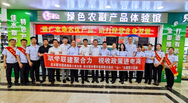 为热烈庆祝中国共产党成立102周年,进一步激发广大党员发挥先锋模范作用,增强基层党组织的创造力、凝聚力和战斗力,6月30日上午,佳木斯市税务局机关第三党支部走进佳木斯市人防办地下商业街,与共建党支部市青年电商联合会党支部共同开展“联学联建聚合力 税收政策进电商”庆“七一”主题活动。佳木斯市国动办党组书记徐泽生,佳木斯市青年电商联合会会长王博,市局第三党支部党员代表及青年电商联合会党支部党员代表共同参加活动。