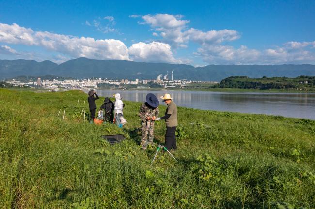 在位于重庆的中国科学院三峡库区水土保持与环境研究站,中国科学院成都山地所科研人员在库区消落带上开展相关监测(2023年7月5日摄,无人机照片)。新华社记者黄伟摄