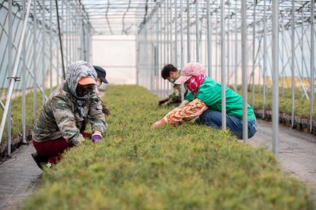 在黑龙江伊春森工集团红松种苗繁育基地,工作人员在养护轻基质红松苗(2023年5月20日摄)。新华社记者张涛摄