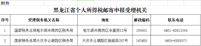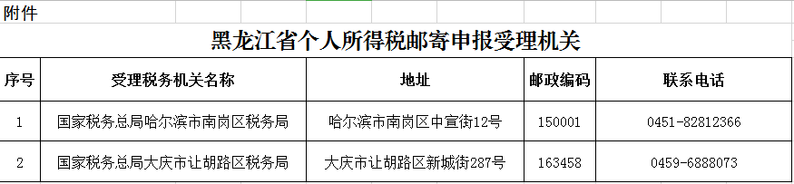 邮寄申报采用定点集中受理方式。国家税务总局黑龙江省税务局指定国家税务总局哈尔滨市南岗区税务局、国家税务总局大庆市让胡路区税务局负责受理全省年度汇算邮寄申报业务。受理邮寄申报税务机关的地址、邮政编码及联系电话见附件。