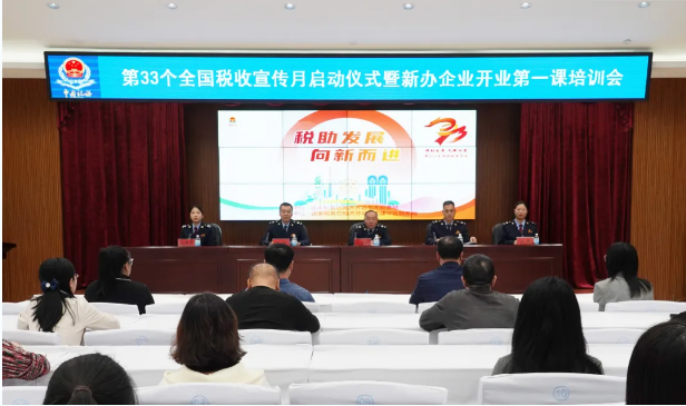 齐齐哈尔市税务局与建华区税务局联合举办第33个全国税收宣传月启动仪式暨新办企业开业第一课活动。市局党委委员、副局长马本清出席并致辞。纳税人缴费人代表以及齐齐哈尔电视台、齐齐哈尔日报等多家媒体现场参加。齐齐哈尔市税务局以小微企业和个体工商户为重点,针对新办企业类型、行业、办税缴费业务场景和服务场景等,提供个性化的服务与指引,为新办企业讲好税收第一课。