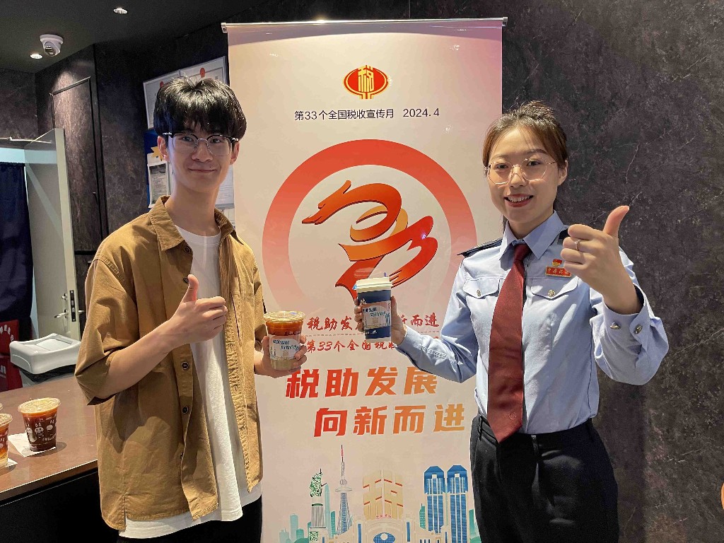同样,在金安国际购物中心的瑞幸咖啡店内,消费者可以享用免费发放的税收宣传月限定版主题杯套。杯套涵盖税收宣传标语、税务服务场景插画等内容,以润物无声的方式让年轻人在品味咖啡的同时增强依法纳税观念。